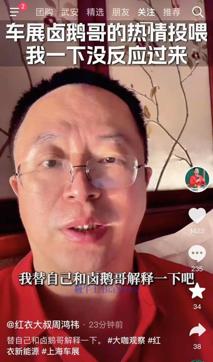4月24日,周鸿祎在社交平台发布视频回应上海车展卤鹅哥给他投喂食物一事,称是一个误会。